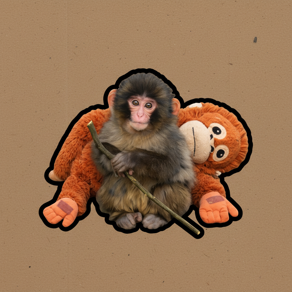Punch the monkey with his beloved plushie friend in a cozy forest sanctuary